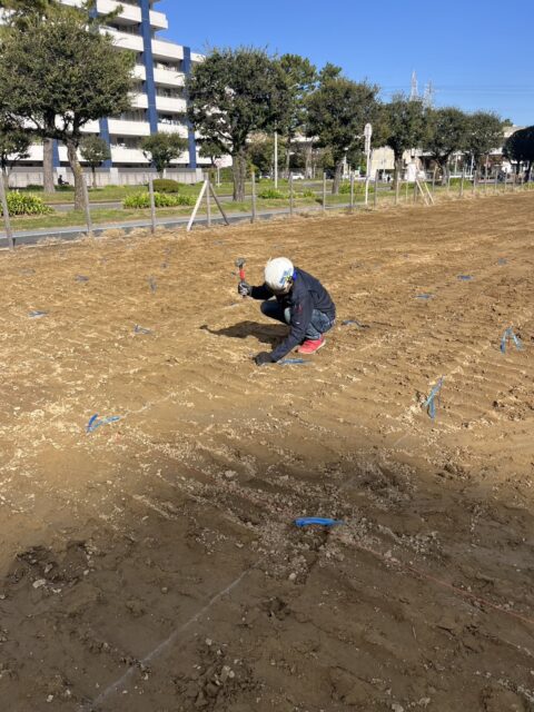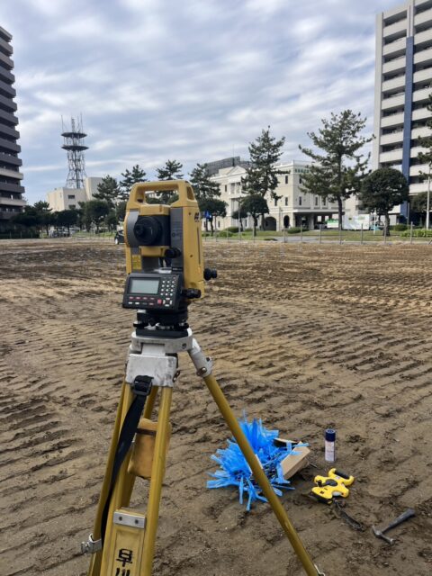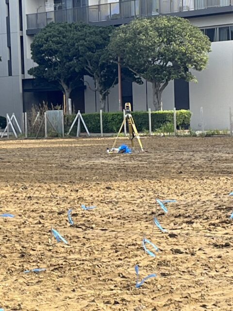 基準点の確認  既存の基準点(BMや丁張りなど)から、杭位置の計算・確認を行います。 光波(トータルステーション)で位置を測る  精密な測定機器を使い、杭芯の座標を現場に反映します。  角度・距離の両方を測り、誤差が出ないよう慎重に作業します。 セパ(杭芯棒)の設置  測った位置にセパを打ち込み、テープを付けて分かりやすく表示。  このセパが、施工業者さんの“目印”となります。