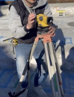 現場では、捨てコンクリート上での基礎墨出し作業に取り組んでおり、レベルを使った高さ確認や通り出しなど、一つひとつの工程を丁寧に覚えながら着実に経験を積んでいます。まだ入社間もないとは思えないほど落ち着いた動きで、先輩の指示をしっかり聞きながら作業している姿が印象的です。